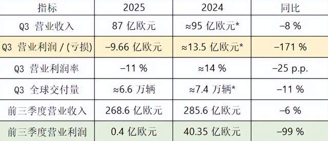 保时捷最新财报显示,保时捷第三季度亏损达9.66亿欧元(约合人民币80亿元),曾经的利润巨头,如今营业利润率仅为0.2%,几乎到了赔钱卖车的地步。